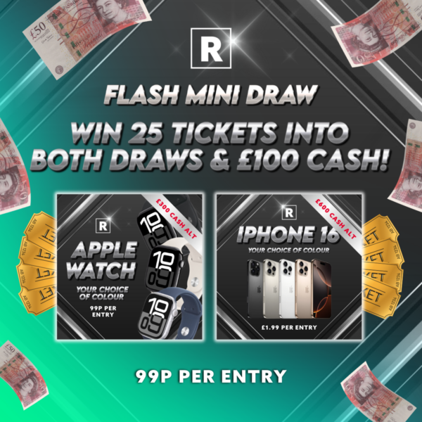 LOW ODDS Flash Mini Auto Draw Alert! Win £100 CASH + 25 Tickets into BOTH the IPhone 16 & Apple Watch Competitions! 🤑  for just 99p!🔥