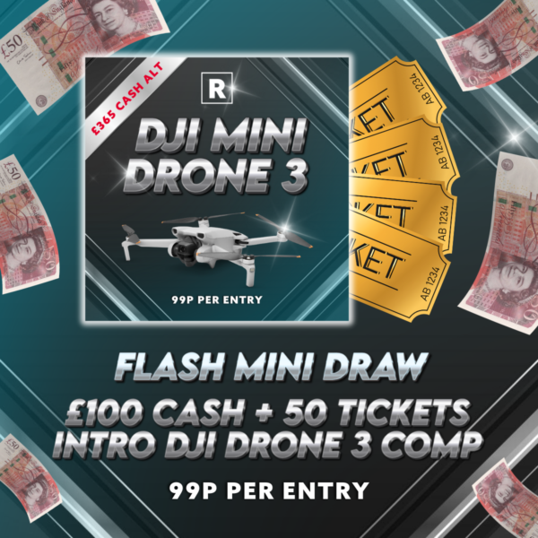 LOW ODDS Flash Mini Auto Draw Alert! Win £100 CASH + 50 Tickets into the DJI Mini 3 Drone Competition! 🤑  All for just 99p!🔥
