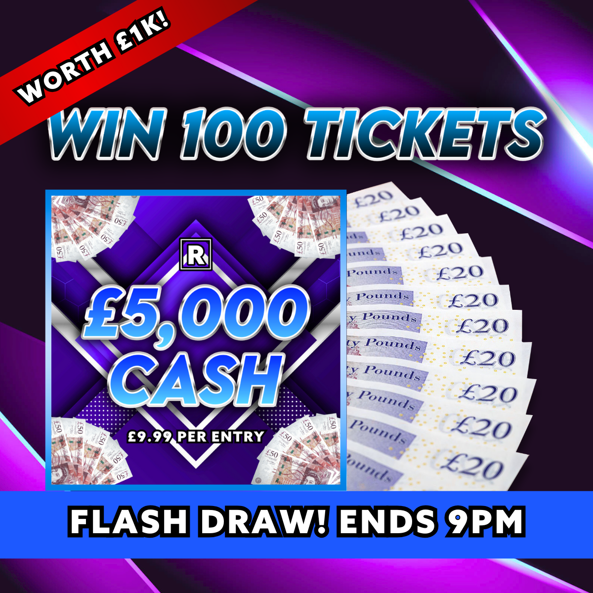 LOW ODDS Flash Mini Auto Draw Alert! Win a MASSIVE 100 Tickets to win a £5000 CASH 🤑 Tickets are just £4.99