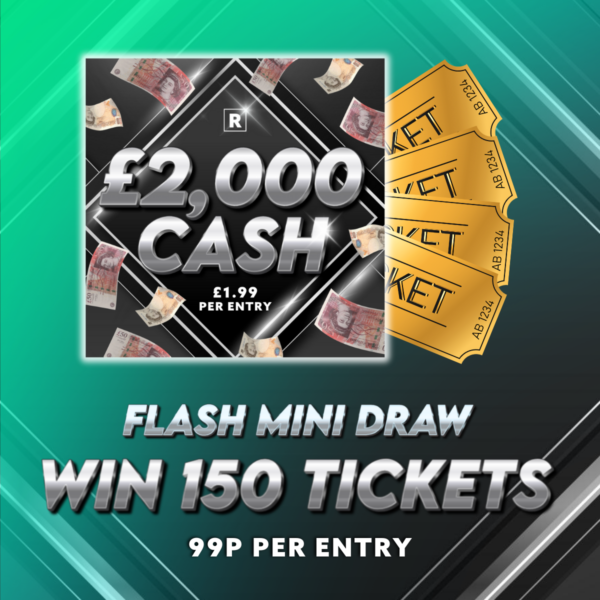 LOW ODDS Flash Mini Auto Draw Alert! Win a MASSIVE 150 Tickets (worth nearly £300!!) for the AWSOME £2000 CASH 🤑 Competition! for just 99p!🔥