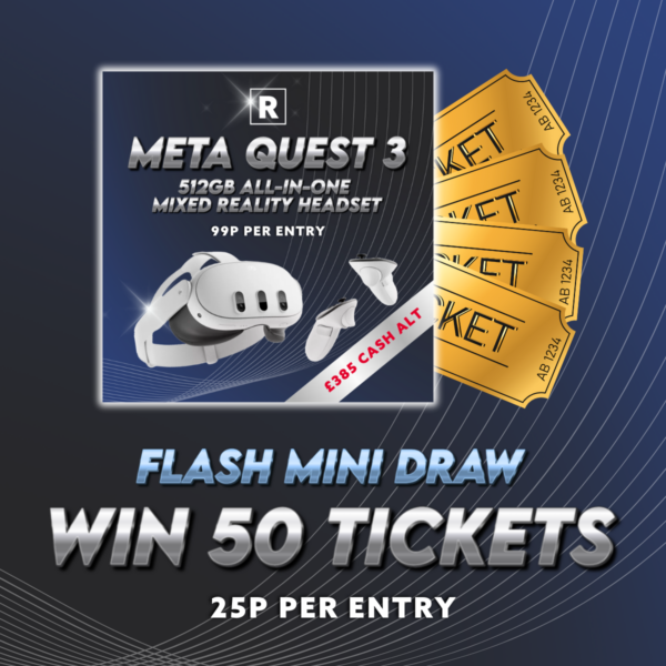 Revere Competitions is here with a LOW ODDS Flash mini competition that offers you a shortcut to winning BIG! This is your chance to secure 50 tickets! 🤑💰 towards the Meta Quest 3 All in One Mixed Reality Headset! competition