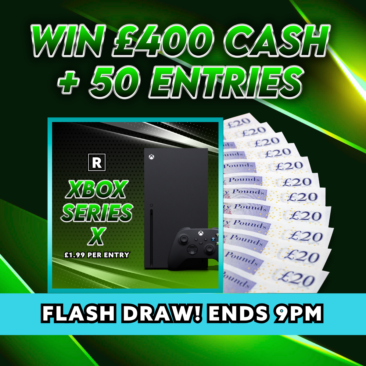 LOW ODDS Flash Mini Auto Draw Alert! Win 50 Tickets into the XBOX 1Tb comp 🤑 PLUS £400 Cash! Tickets are just £1.99